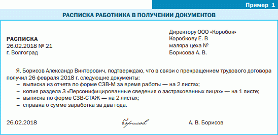 1. Взять с работника расписку, подтверждающую, что он получил все необходимые документы (пример 1).