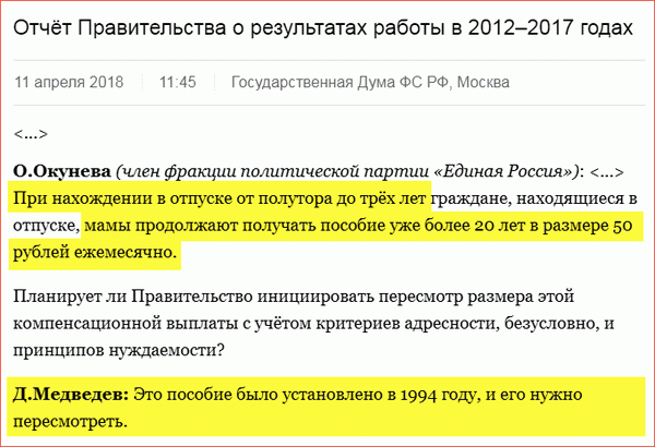Еще весной Дмитрий Медведев, выступая в Госдуме с ежегодным отчетом Правительства, предложил «пересмотреть» ежемесячное пособие в размере 50 рублей, которое было установлено более 20 лет назад указом Президента от 30.05.1994 г. № 1110 и которое выплачивается в отпуске по уходу за ребенком до 3 лет из средств работодателя: